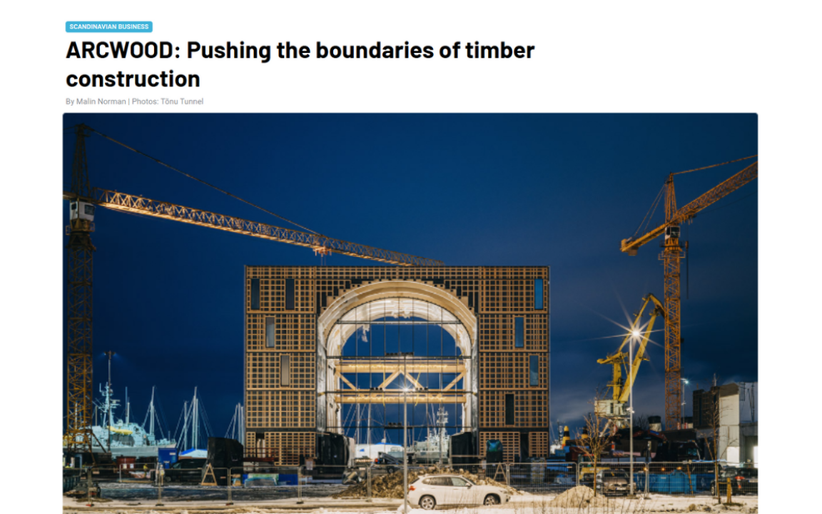 The article presents buildings where ARCWOOD’s timber structures play a central role. Highlighted examples include the Pelgulinna State Gymnasium and the Tallinn Nature House, which is currently under construction and uses timber as the primary load-bearing material.